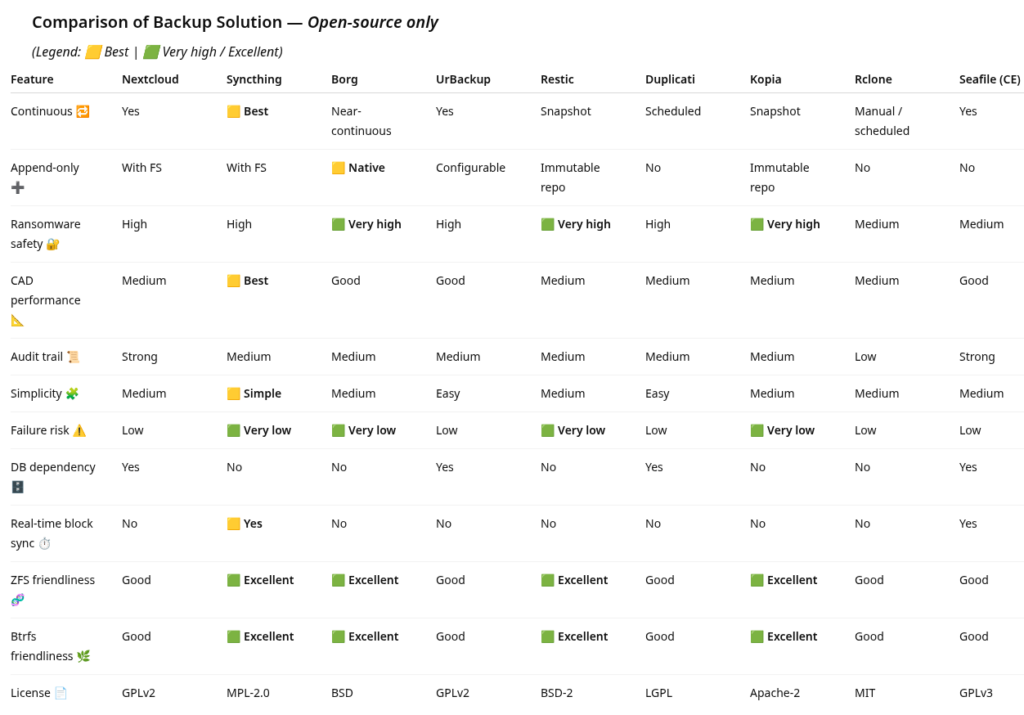 I have to choose a backup solution for a team of 60 CAD users with no proprietary software dependency. I did research popular and widely used backup options across practical, real-world criteria such as data safety, ransomware resistance, filesystem friendliness (ZFS/Btrfs), reliability, and ease of use.