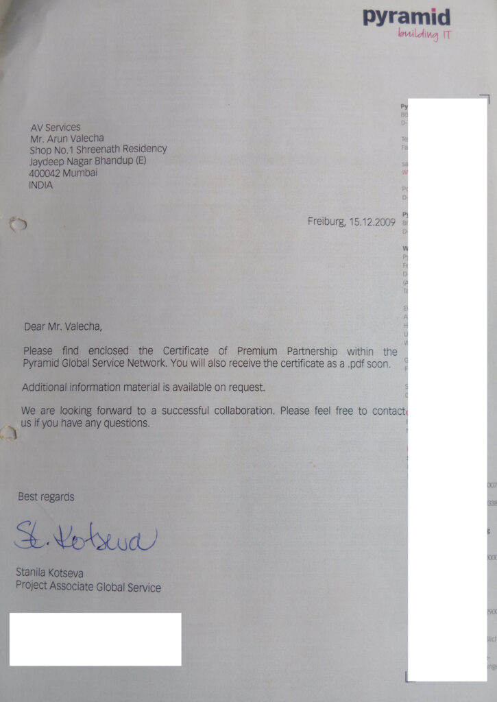 In December 2009, AV Services was formally certified as a Technology Partner by Pyramid Computer GmbH. At the time, AV Services was among a very small number of Indian independent professionals to hold European vendor certification in this domain.